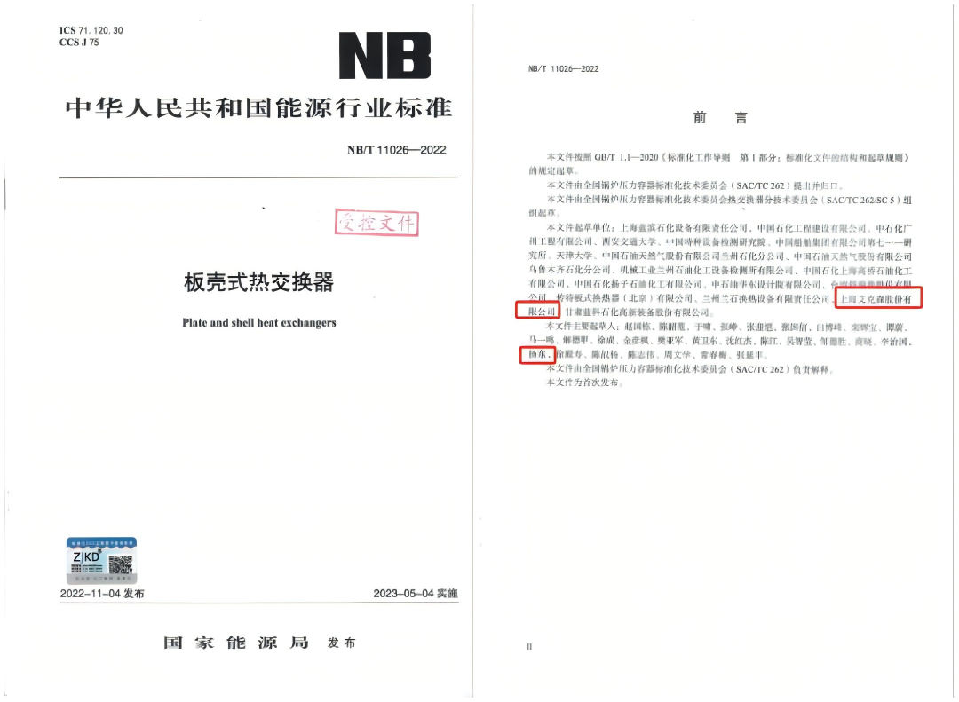 上海艾克森作为换热设备研发、制造、销售及服务的领先企业之一,深耕石油石化天然气领域20 余年,是中石油一级供应商、中石化与中海油合格供应商,还参与能源行业多项标准制定,与中石化及各大院校单位联合起草了《板壳式热交换器》能源行业标准NB/T 11026-2022,该标准由国家能源局发布并于 2023 年 5 月 4 日正式实施,是国内板壳式换热器领域首次发布的行业标准,明确了板壳式热交换器在材料、设计、制造、检验、验收及安装使用等全流程的技术要求,为行业产品规范化、高质量发展奠定了重要基础,也为 LNG 等高端能源领域的换热设备应用提供了权威技术依据。