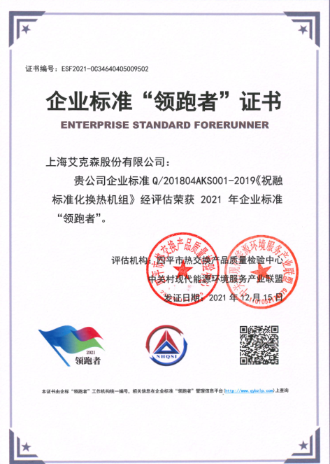 近日,由国家市场监督管理总局指导、中国标准化研究院组织评选的《2021企业标准“领跑者”榜单》正式发布,艾克森“板式热交换器”和“祝融标准机组”各项技术指标经第三方评估机构和专家评审,均高于国家标准并处于行业领先位置,优势显著,再次荣获换热产品2021年企业标准“领跑者”称号。