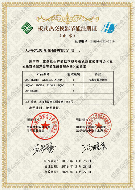 2019年4月20日,根据《板式热交换器产品节能注册管理办法》规定及经国家热交换器产品质量监督检验中心(上海)产品测试,和对生产技术设计等全方位的专家审查、评审,上海艾克森集团最终获得了中国特种设备安全与节能促进会颁发的《板式热交换器节能注册证》,作为首批八家获得节能注册证的企业之一,艾克森的一级能效和节能产品都名列前茅。