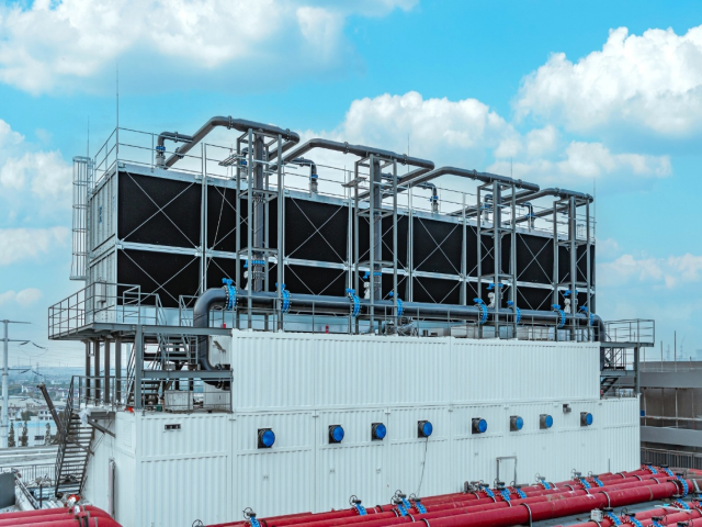 通过平面布局的弹性设计,将风冷、液冷部分公用一套冷却水系统,冷却塔、集成冷站集中设置于屋面框架梁上,利用建筑内空间和室外平台乃至屋顶平台空间的转换,可以让40000㎡的建筑单体达50-60MW的设计容量弹性规划布局。在屋面供回水管路成环并在垂直立管到对应机房末端空调区,除提高了制冷系统的运行效率,同时解决了楼层机房公共区域综合管线设置的压力,提高机房垂直空间的利用,为空间极致利用起到了很好的示范作用。